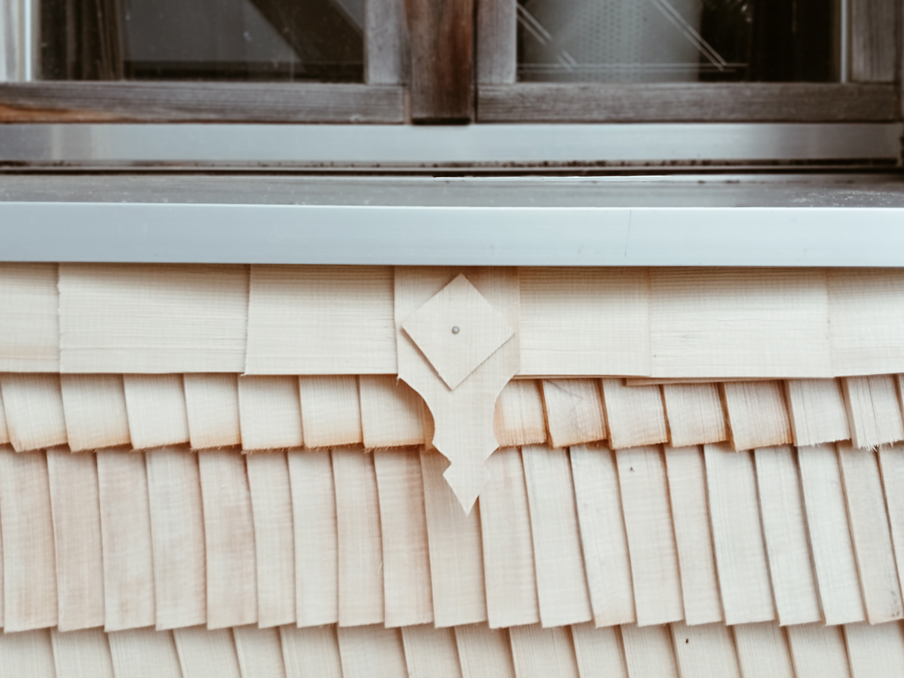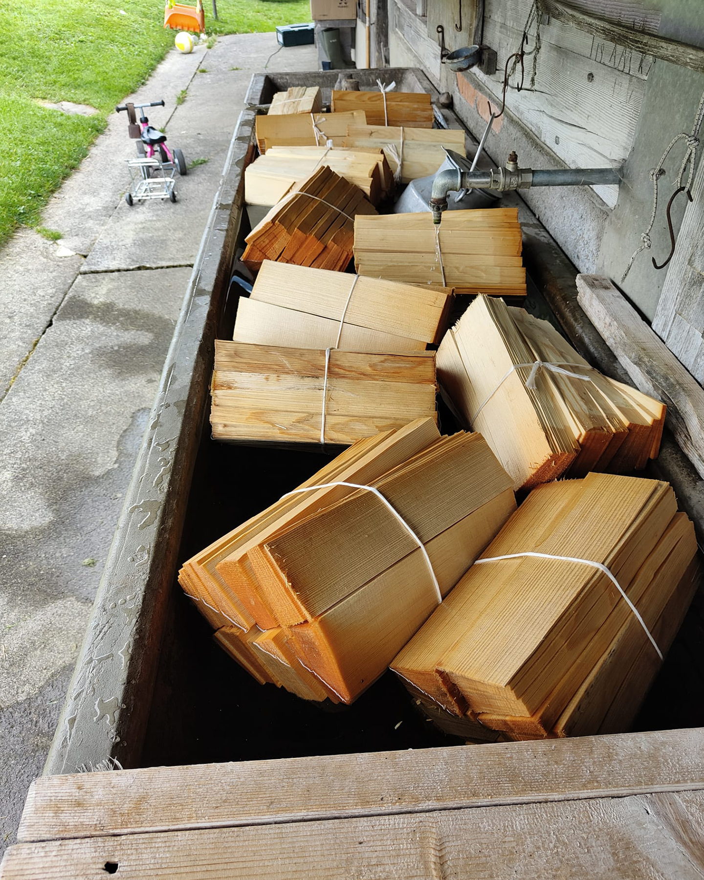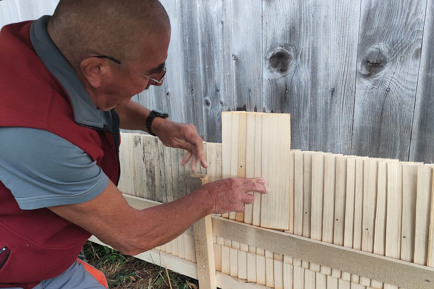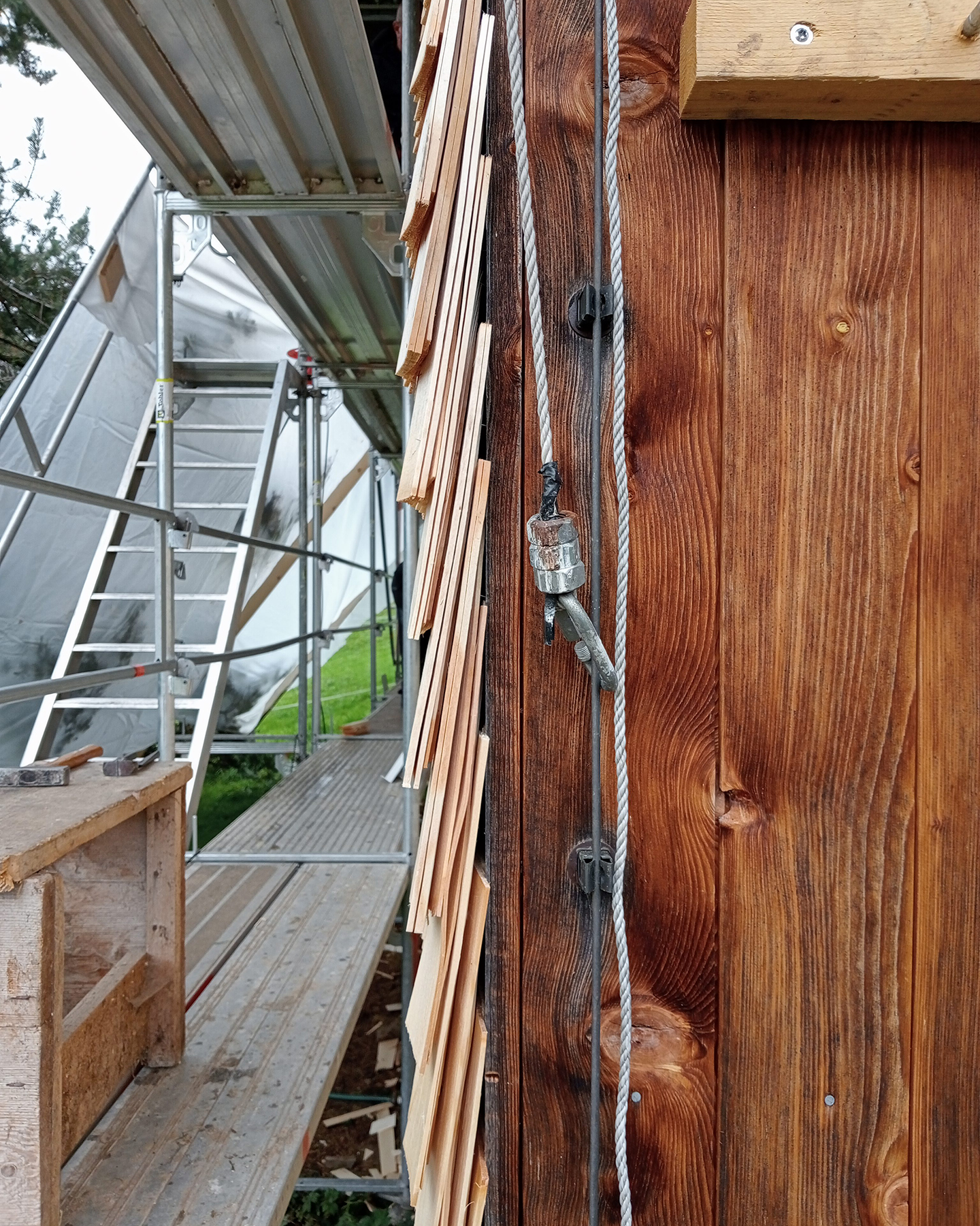 Am Montagmorgen erhielten die freiwilligen Helfer vom Hersteller persönlich eine Einführung in die richtige Montage der Schindeln. Die verwendeten Schindeln waren im letzten Winter von einem ortansässigen Schindelmacher von Hand hergestellt worden. Das verwendete Holz stammte aus einheimischer Rottanne. Im Alpbrunnen wurden die Schindeln vorgängig gewässert; dadurch wurde erreicht, dass sich die Schindeln beim Annageln nicht spalten. Nach der Instruktion wurden die Schindeln fachgerecht und präzis an die Fassade angenagelt. Es galt zu beachten, dass die richtige Seite nach aussen steht und die richtige Neigung strikt eingehalten wird, so dass Regenwasser oder Schnee wetterseits schön abtropfen und nicht in die Mauer eindringen.
