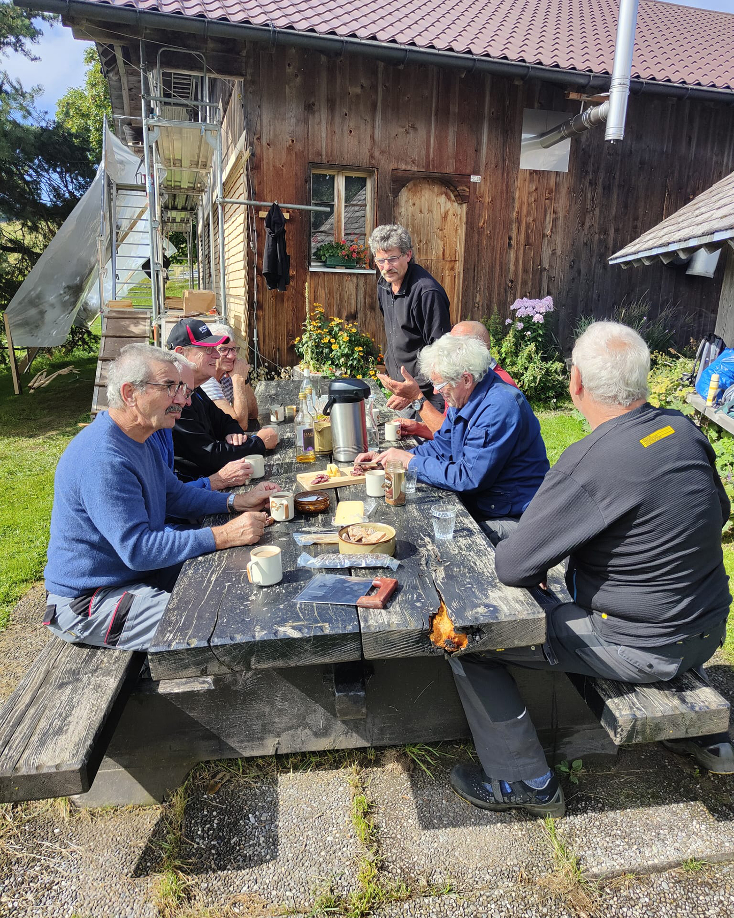 Die zehn Freiwilligen der Arbeitsgruppe besuchten am späten Sonntagnachmittag erstmalig die Baustelle. Die junge Bergbauernfamilie überraschte sie mit einem Raclette aus selbst hergestelltem Alpkäse. Das Raclette wurde im Freien eingenommen und mundete allen. Die einmalige Rundsicht mit Eiger, Mönch und Jungfrau mit einem leichten Abendrot machte den Abend perfekt.