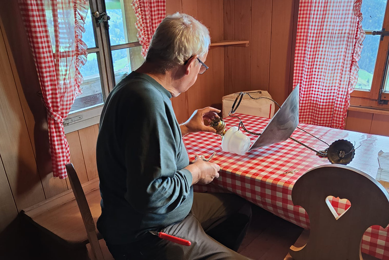 Der Vater von Martin konnte im Jahr 2000 einen neuen Alpstall mit Melkstand bauen. Die Stromversorgung wird durch eine «mobile PV–Anlage mit Salzbatterie» sichergestellt. Damit kann die Alp ihren eigenen Strom für das maschinelle Melken erzeugen. Im Winter wird die ganze Anlage zum Heimbetrieb gezügelt und dort für die eigene Stromproduktion eingesetzt. Leider fehlte bis anhin die Stromversorgung der Alphütte, wo Aeschlimanns im Sommer wohnen und arbeiten. Nur kleine Lämpchen, die durch Autobatterien gespeist werden, die wiederum durch die Solaranlage aufgeladen werden, waren die Lichtspender. Elektriker André Bühlmann stellte deshalb in der Einsatzwoche die elektrische Versorgung der Alphütte mittels Kabelverlegung und Installation neuer Steckdosen sicher. Familie Aeschlimann freute sich riesig über die längst ersehnte Komfortsteigerung.