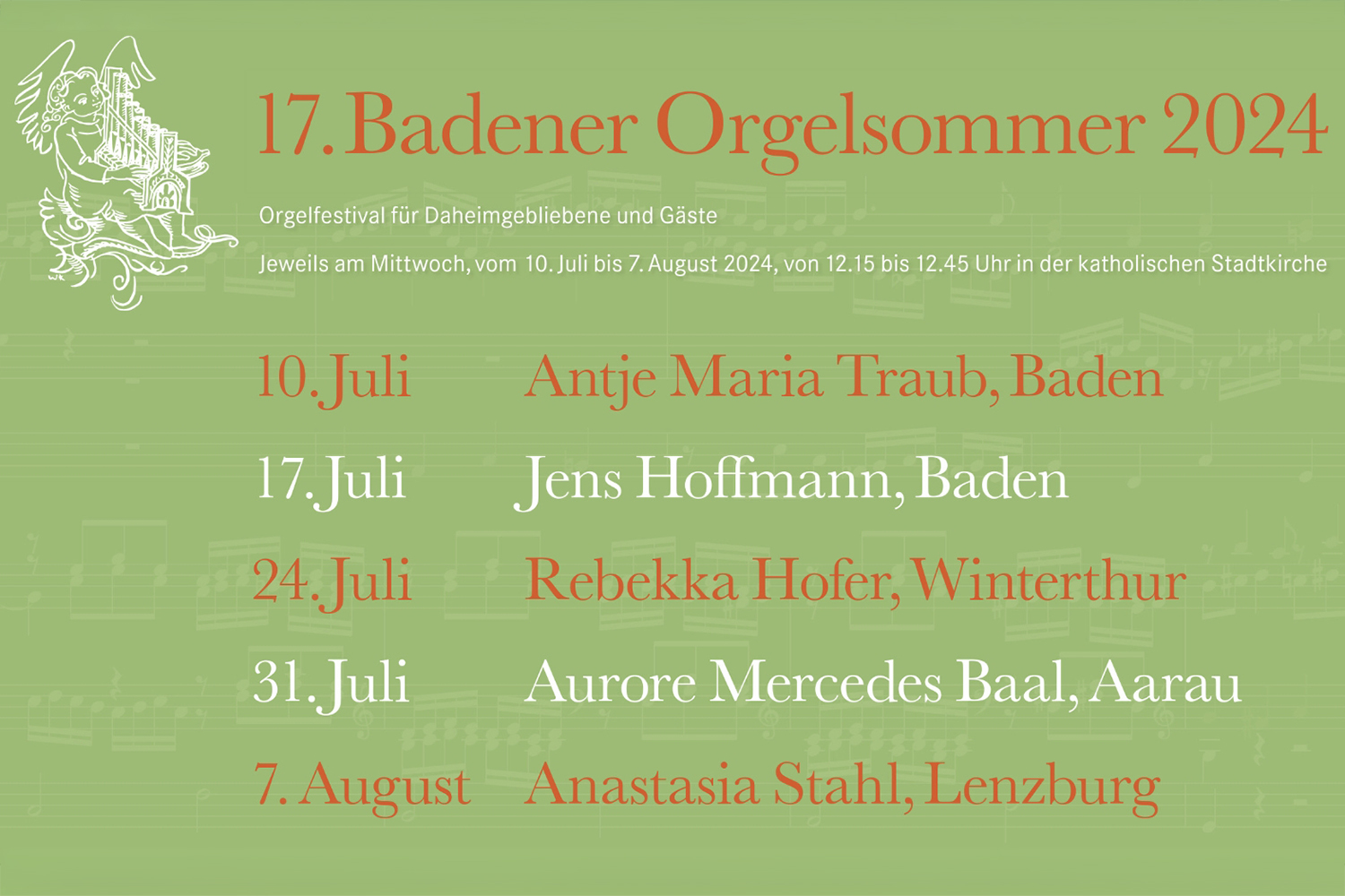 DAS Orgelfestival für alle Daheimgebliebenen und BesucherInnnen der Stadt Baden. Die beliebte Konzertreihe wird 2024 bereits zum 17. Mal durchgeführt. Während den Sommerferien kommen die Besucher des Badener Orgelsommers in den Genuss dieser musikalischen Aufführungen in der Stadtkirche Baden.