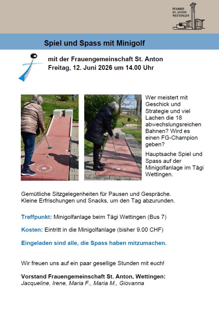 Freitag, 12. Juni - 14:00 Uhr Spiel und Spass auf der Minigolfanlage im Tägi Wettingen. TeilenTwitternTeilen Veranstaltung als PDF herunterladen